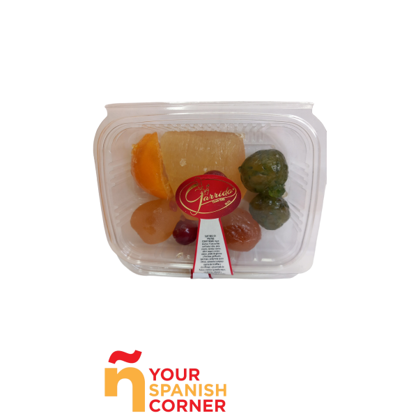 Früchte (Kürbis, Aprikose, Zitrone, Pflaume, Orange und kandierte Kirsche (Kirsche; Zucker, Glukose- und Fruktosesirup, Säuerungsmittel (Zitronensäure); Konservierungsmittel (Natriummetabisulfit); Farbstoff (Erythrosin)), Zucker, Glukose- und Fruktosesirup, Geliermittel (Pektin); Säuerungsmittel (Zitronensäure), Konservierungsmittel (Natriummetabisulfit), Farbstoffe (E-102; E-129; E-131). Kann Spuren von Gluten, Ei, Milch, Erdnüssen, Schalenfrüchten, Sesam, Senf und Soja enthalten.