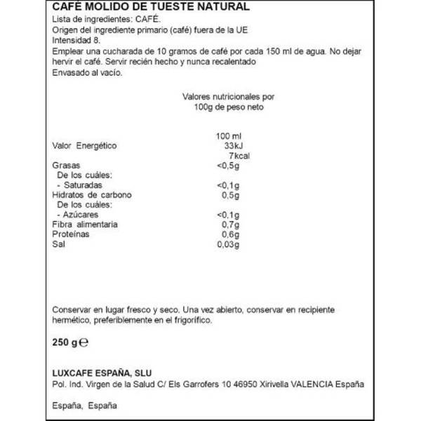 Gemischter gemahlener Kaffee, 50% natürlich geröstet und 50% Torrefacto-Röstung. Ein Kaffee, den Sie in traditionellen Kaffeemaschinen verwenden können.