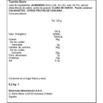 Der harte Nougat von EL ALMENDRO wird mit einem sehr hohen Anteil an gerösteten Mandeln hergestellt, das Ergebnis der Mischung einer erlesenen Mandel mit Karamell (Honig und Zucker), dem Eiweiß zugesetzt wird (wodurch die weiße Farbe erreicht wird, die ihn so charakterisiert). das Ergebnis ist dieses Nougat höchster Qualität. Hartes Nougat ist eine klassische spanische Weihnachtssüßigkeit.