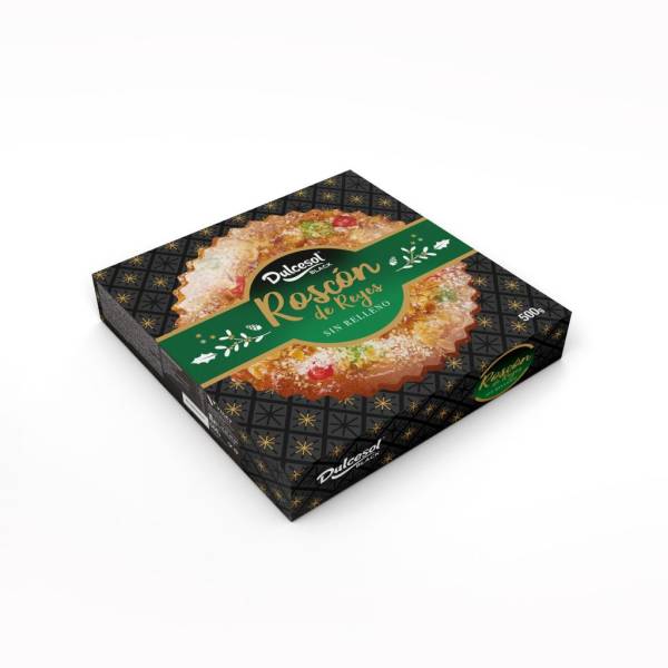 Industrieller Roscón de Reyes ohne Füllung, dekoriert mit kandierten Früchten und Mandeln.