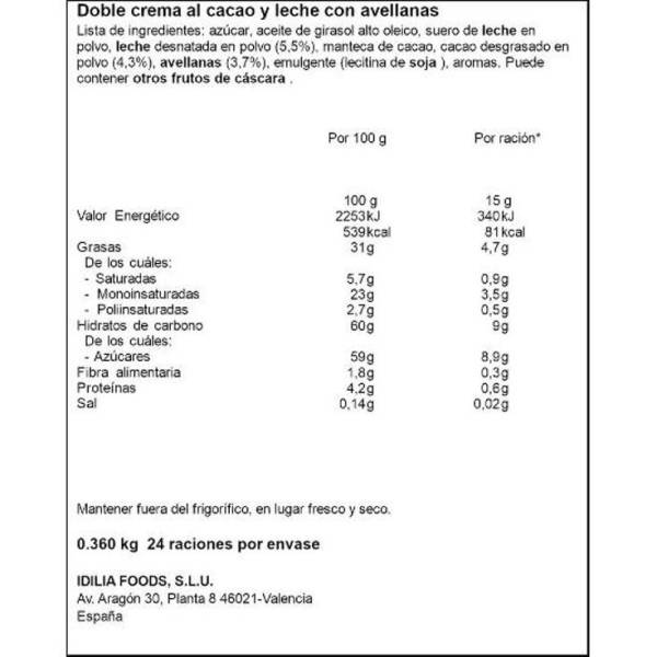 Sugar, high oleic sunflower oils, milk solids, skimmed milk powder (5.5%), cocoa butter, defatted cocoa powder (4.3%), hazelnuts (3.7%), emulsifier (soy lecithin ), aromas. May contain other nuts.
