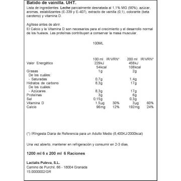 Partially skimmed milk at 1.1% fat (90%), sugar, aromas, stabilisers (E339ii, E407), vanilla extract (0.1%), dye (beta carotene), vitamin D.