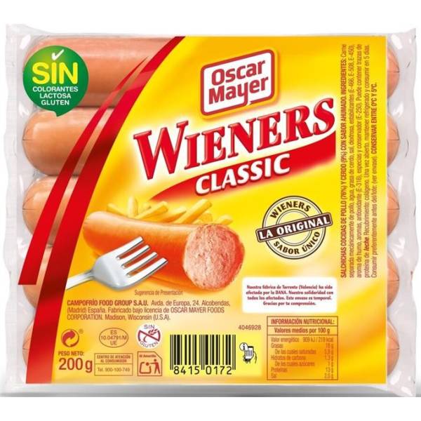 Chicken (58%), pork (24%). Mechanically separated chicken meat, pork fat, water, salt, dextrose, stabilisers (E466, E508, E450), aromas and spices, smoke aroma, antioxidant (E316), preservative (E250). May contain traces of soy and milk protein.