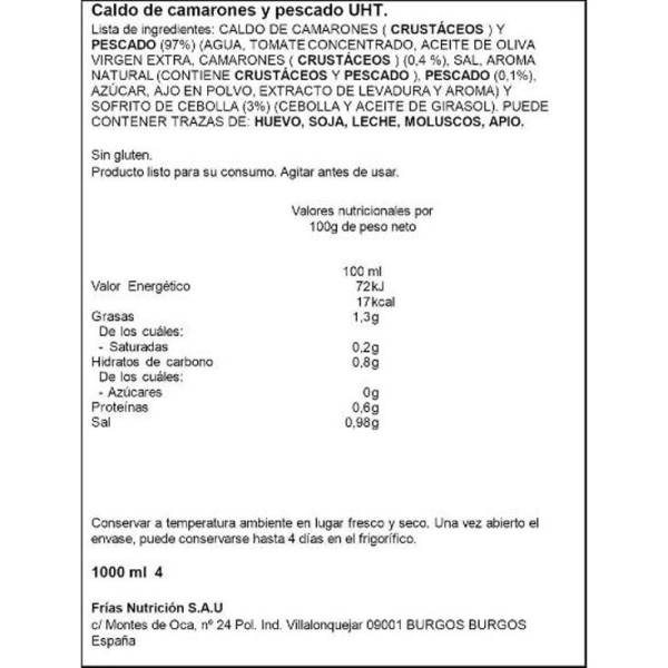 El caldo de pescado de Gallina Blanca está elaborado a base de pescados, tales como bacalao. Contiene verduras como zanahoria, patata, cebolla y tomate. Todo esto hacen de él un caldo muy sabroso, tanto para sopa como para añadir a una paella de marisco. Contiene 1 litro.