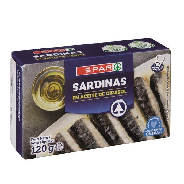 Sardinas enlatadas preparadas en aceite de girasol de la marca SPAR. Se trata de pescado en conserva, que puede ser un aperitivo ideal para compartir con amigos y familiares.