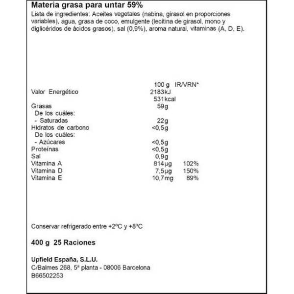 Aceites vegetales (girasol y nabina en proporciones variables), grasa vegetal (coco), agua, sal (0,9%), suero de mantequilla, emulgente (lecitina), acidulante (ácido láctico), aroma natural, vitaminas (A, D, E).
