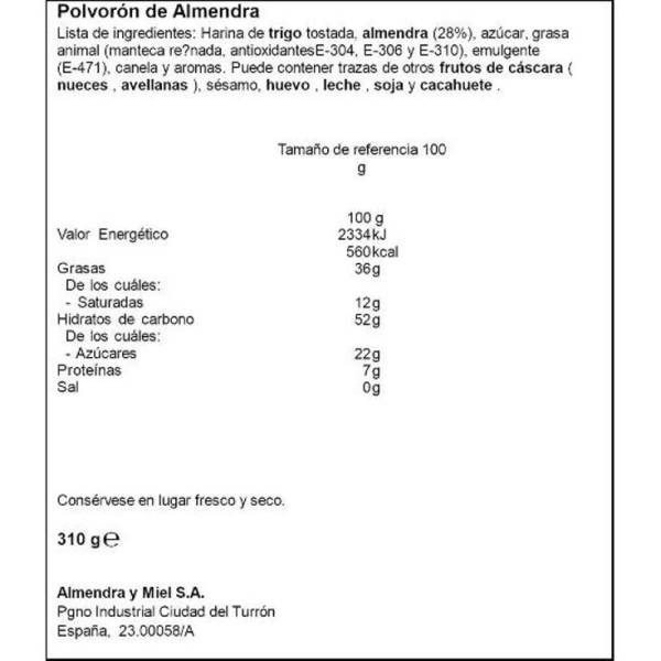 Listado de ingredientes: Harina de trigo tostada, almendra (28%), azúcar, grasa animal (manteca refinada, antioxidantes E-304, E-306 y E-310), emulgente (E471) canela y aromas. Puede contener trazas de otros frutos de cáscara, (nueces, avellanas), sésamo, huevo, leche, soja y cacahuete.