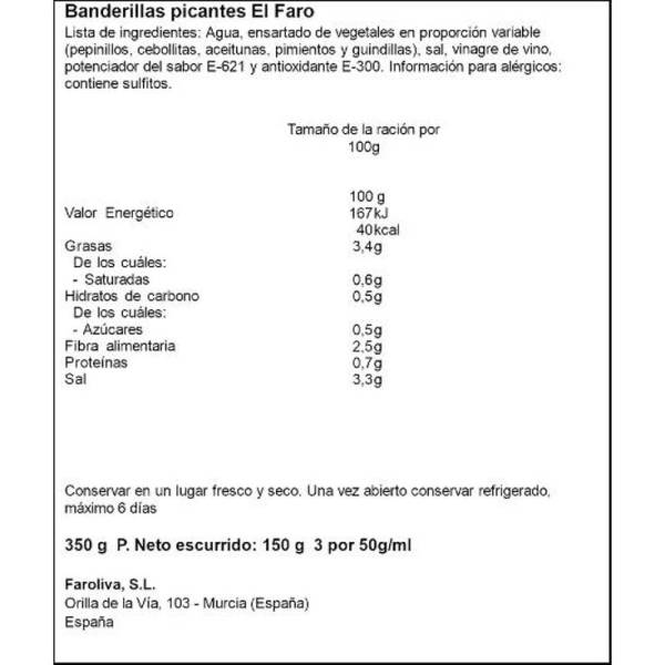 Cornichons, oignons, olives farcies au poivre, poivre, piments, eau, sel, vinaigre de vin, exhausteur de goût.